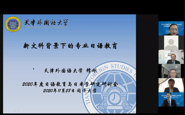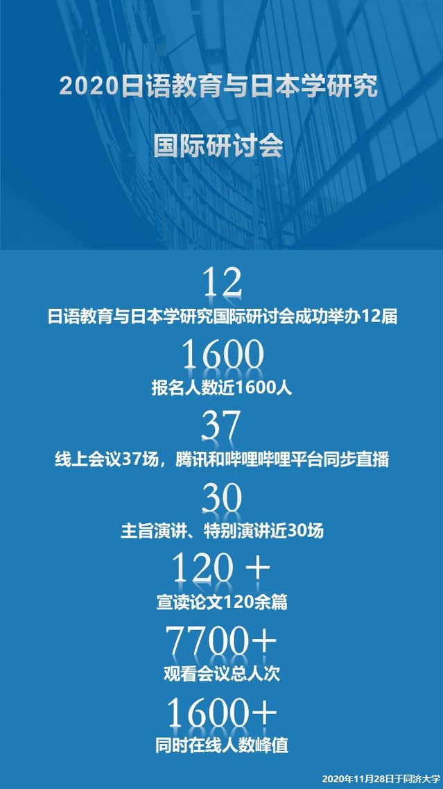 2020年11月28日,由教育部正式批准,教育部高等学校教学指导委员会日语分委员会、中国日语教学研究会上海分会主办、同济大学外国语学院承办的“2020日语教育与日本学研究国际研讨会”在云端举行,并通过腾讯会议和哔哩哔哩平台同步直播。本次会议报名参会人数近1600人,其中研究生报名参会人数超过200人,是迄今为止规模最大的日语教育与日本学研究国际盛会。