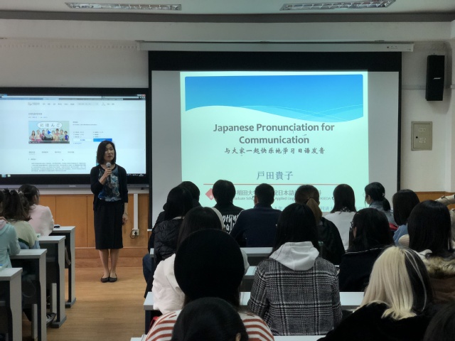 讲座上,户田教授用中文和上海话亲切地向参加者问好,然后图文并茂,生动有趣地介绍了她的科研团队在全球首创的日语学习慕课—“Japanese Pronunciation for Communication”。