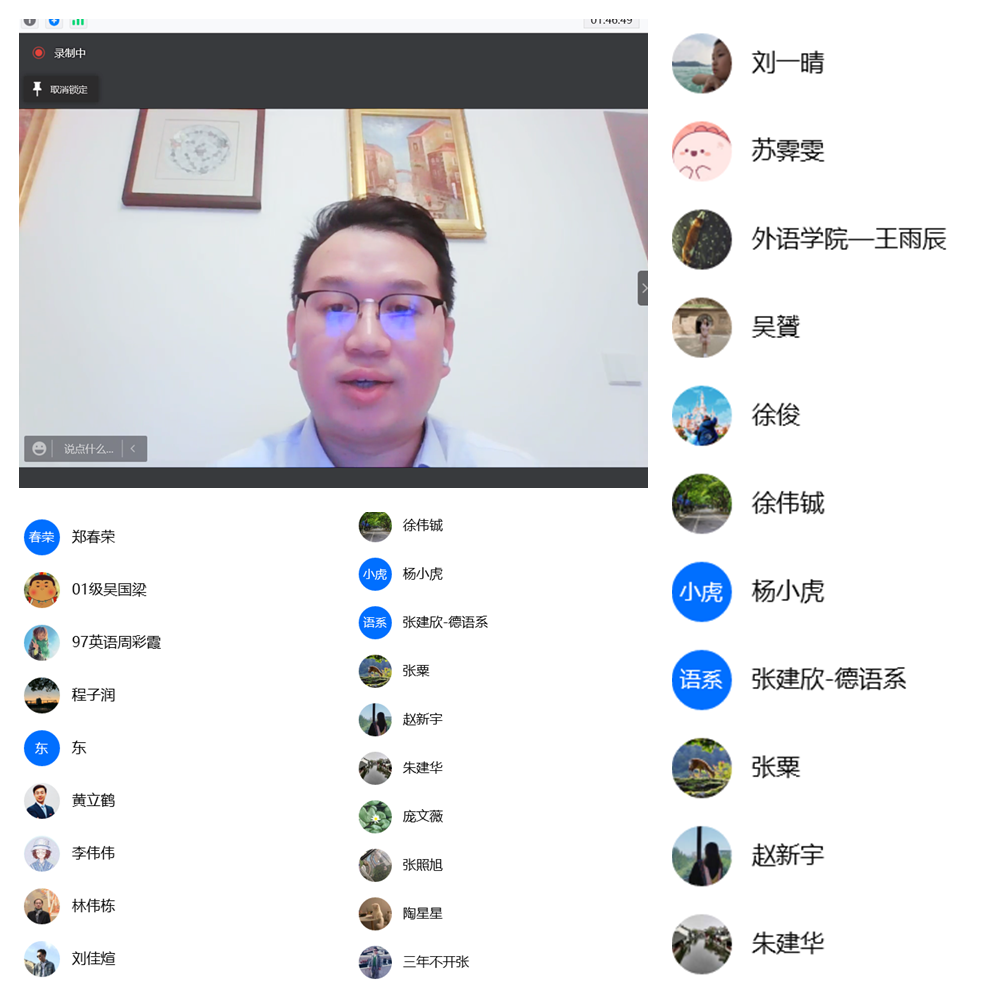 外国语学院院友会会长郑春荣首先致辞,他向院友理事们介绍了学院在“十三五”时期取得的标志性成果和“十四五”规划的主要目标任务,从学科发展、人才培养、科学研究、国际合作、学院治理等多个方面阐述了学院“十四五”规划的工作思路、目标和主要指标。他表示学院的发展离不开广大校友的关心和支持,期待各位校友理事一如既往地关心和支持学院的建设与发展。